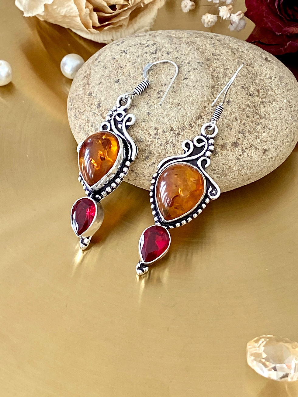 Baltic Amber And Garnet Handcrafted Earrings