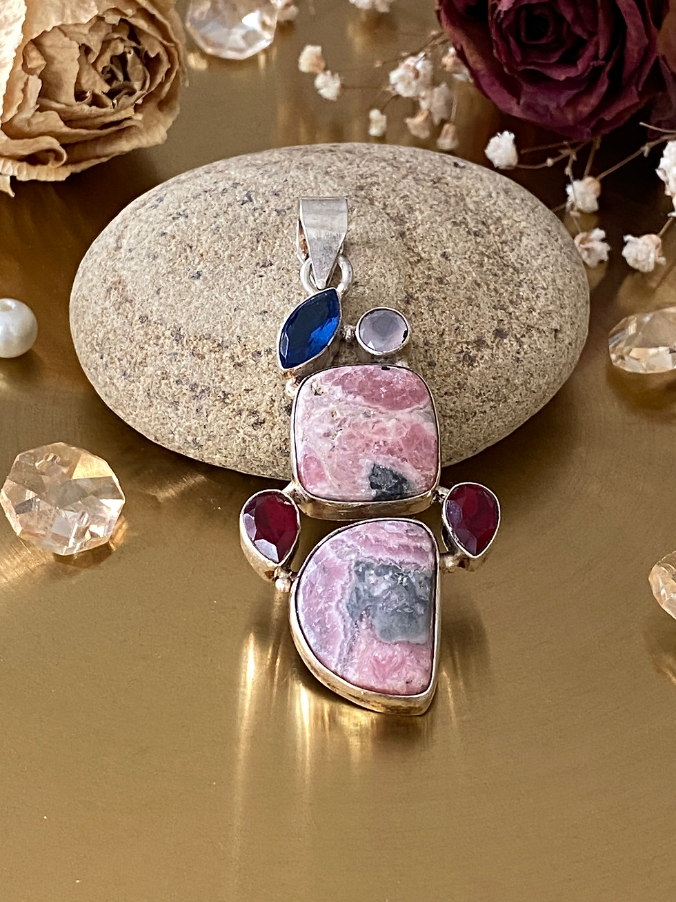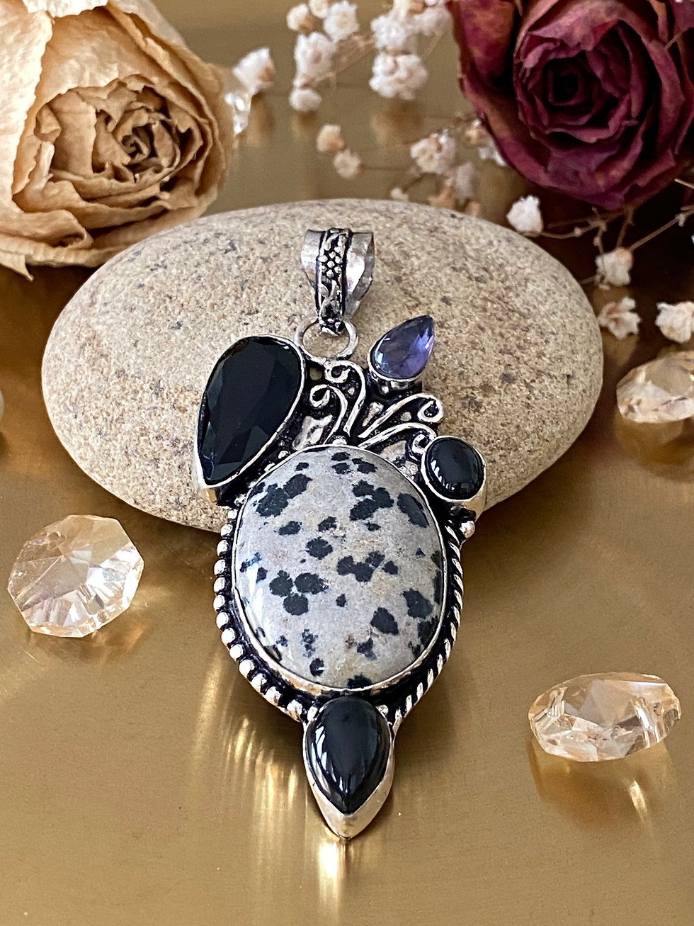 New in gift box handcrafted 925 sterling silver overlay natural carved agate, synthetic onyx and synthetic blue topaz pendant.